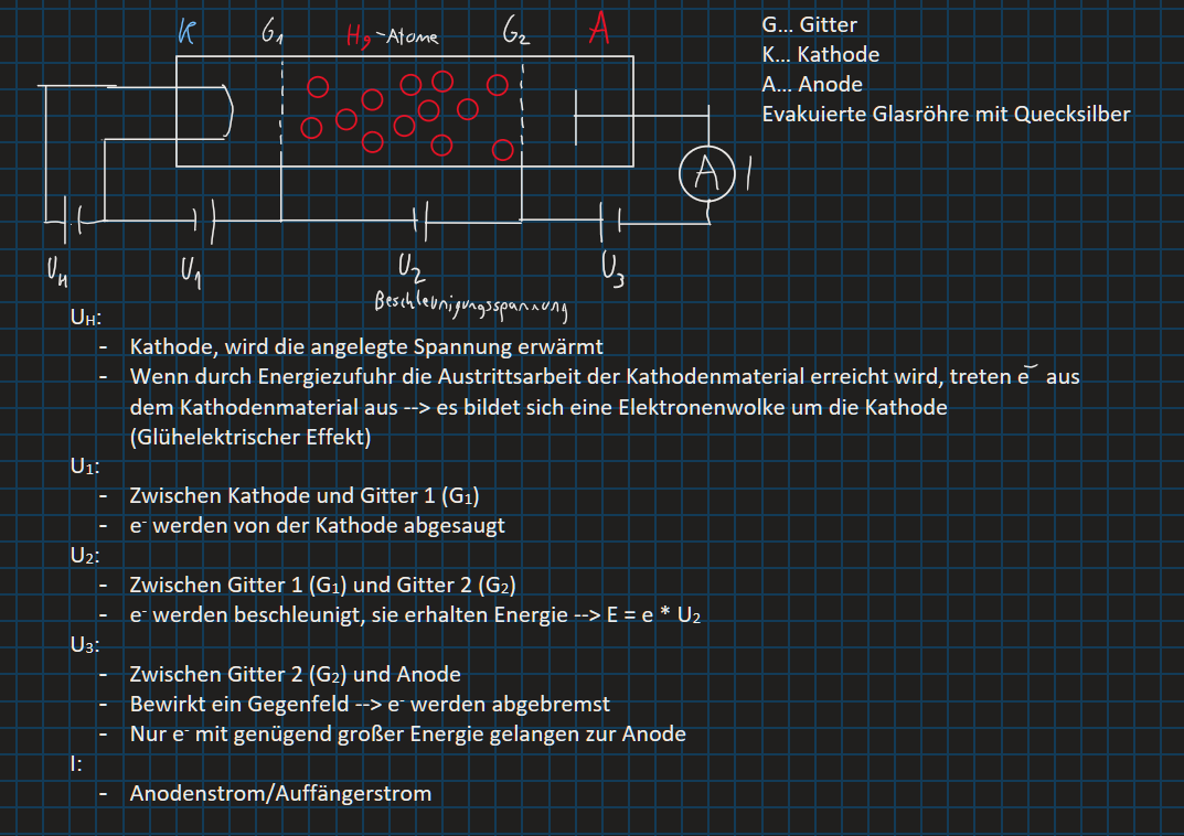 • Inelastische Stöße, bei denen das Elektron genau die Anregungsenergie des Hg-Atoms abgibt. Hinterher reicht die Restenergie des Elektrons nicht mehr aus um zum Auffänger zu gelangen, wenn die Beschleunigungsenergie nur knapp über der Anregungsenergie (oder einem Vielfachen davon) war. Je nach Beschleunigungsspannung wandern die Anregungszonen (siehe Skizzen unter dem Diagramm) vom Gitter hin zur Kathode. Ist die letzte Anregungszone in der Nähe des Gitters sinkt der Auffängerstrom ab.