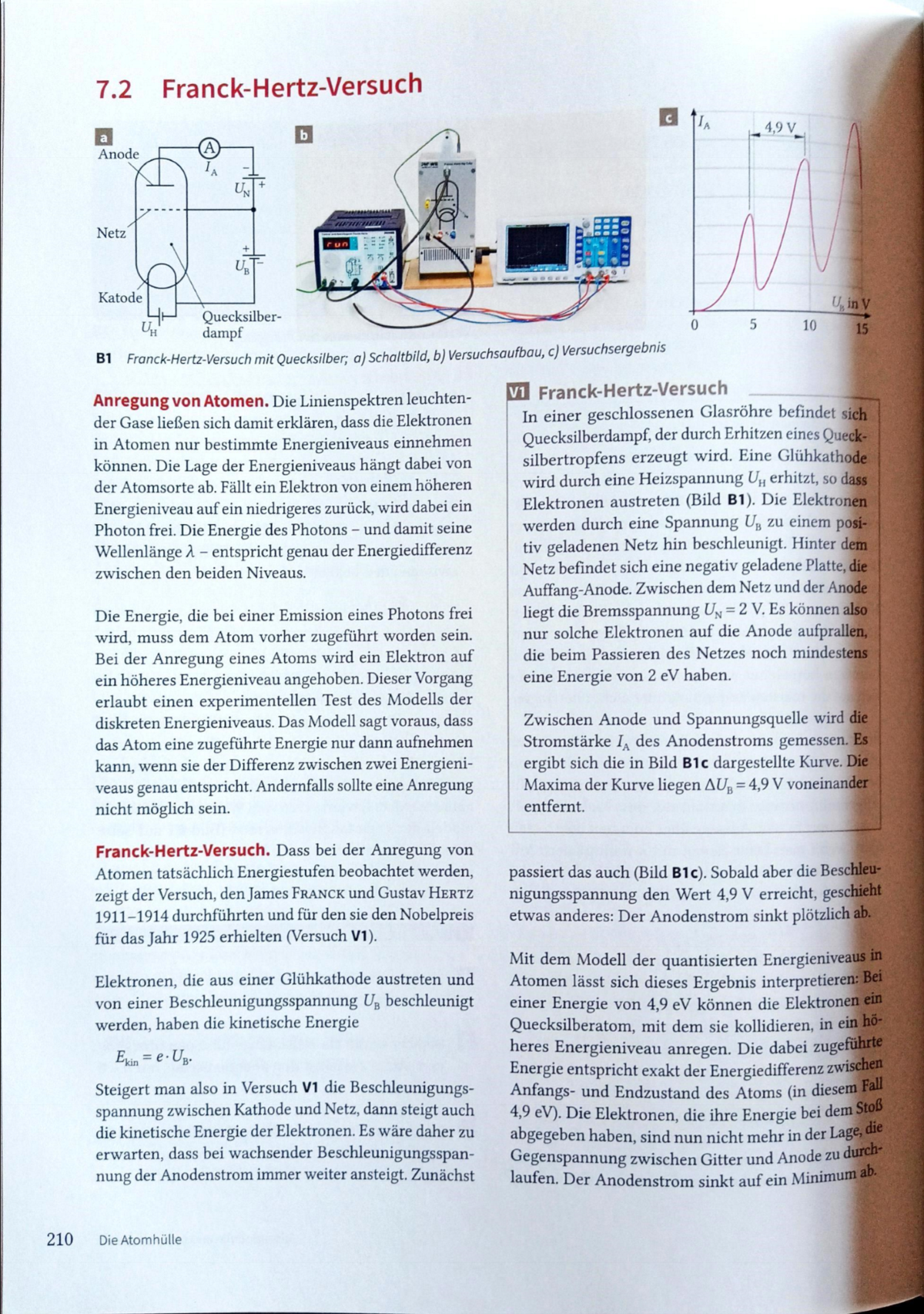 Der zweite Abfall des Auffängerstroms tritt ein, wenn die unelastischen Stöße etwa in der Mitte zwischen Kathode und Gitter erfolgen und die Elektronen unmittelbar vor der Anode wieder genügend Energie besitzen, um eine zweite Anregung durchzuführen… .